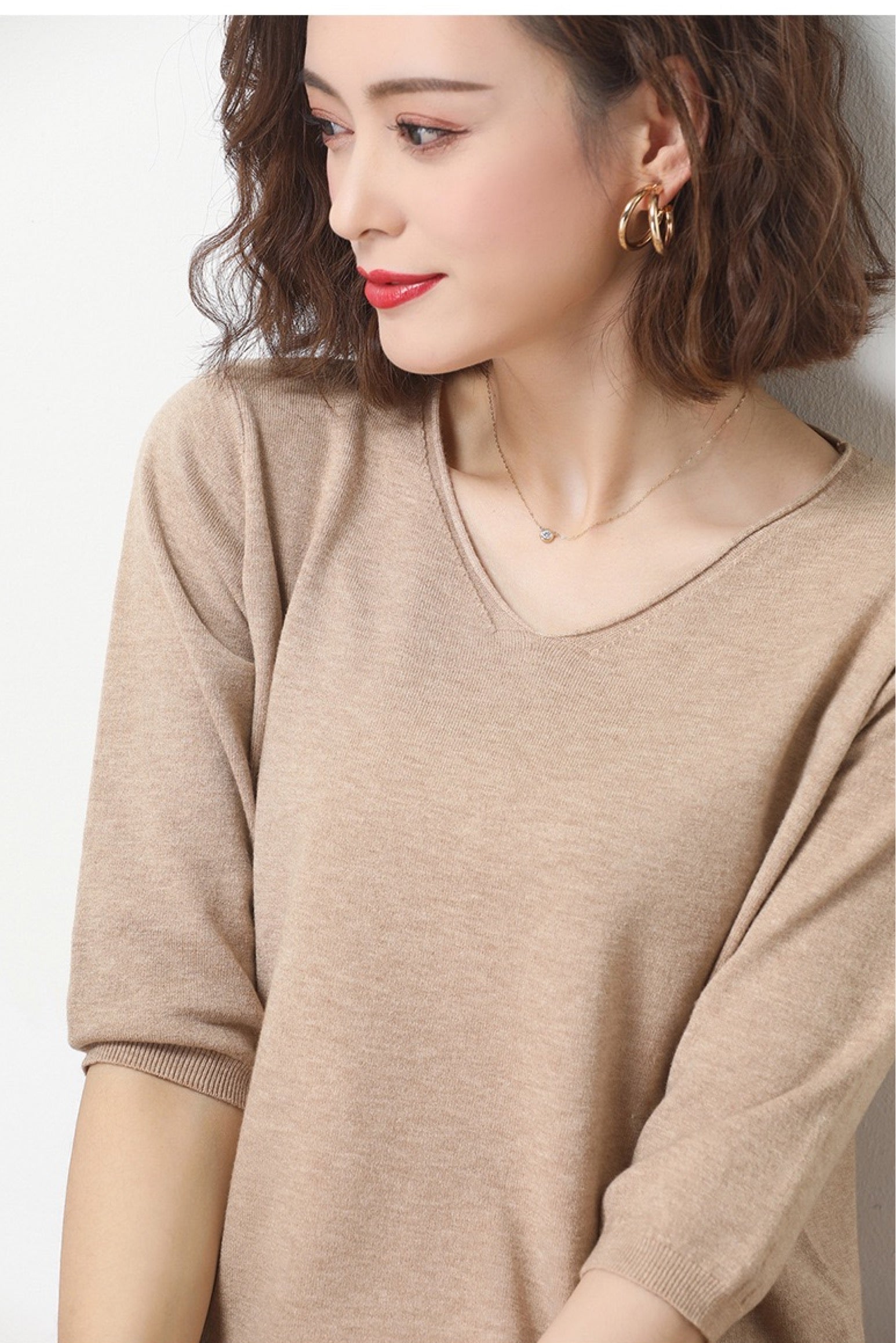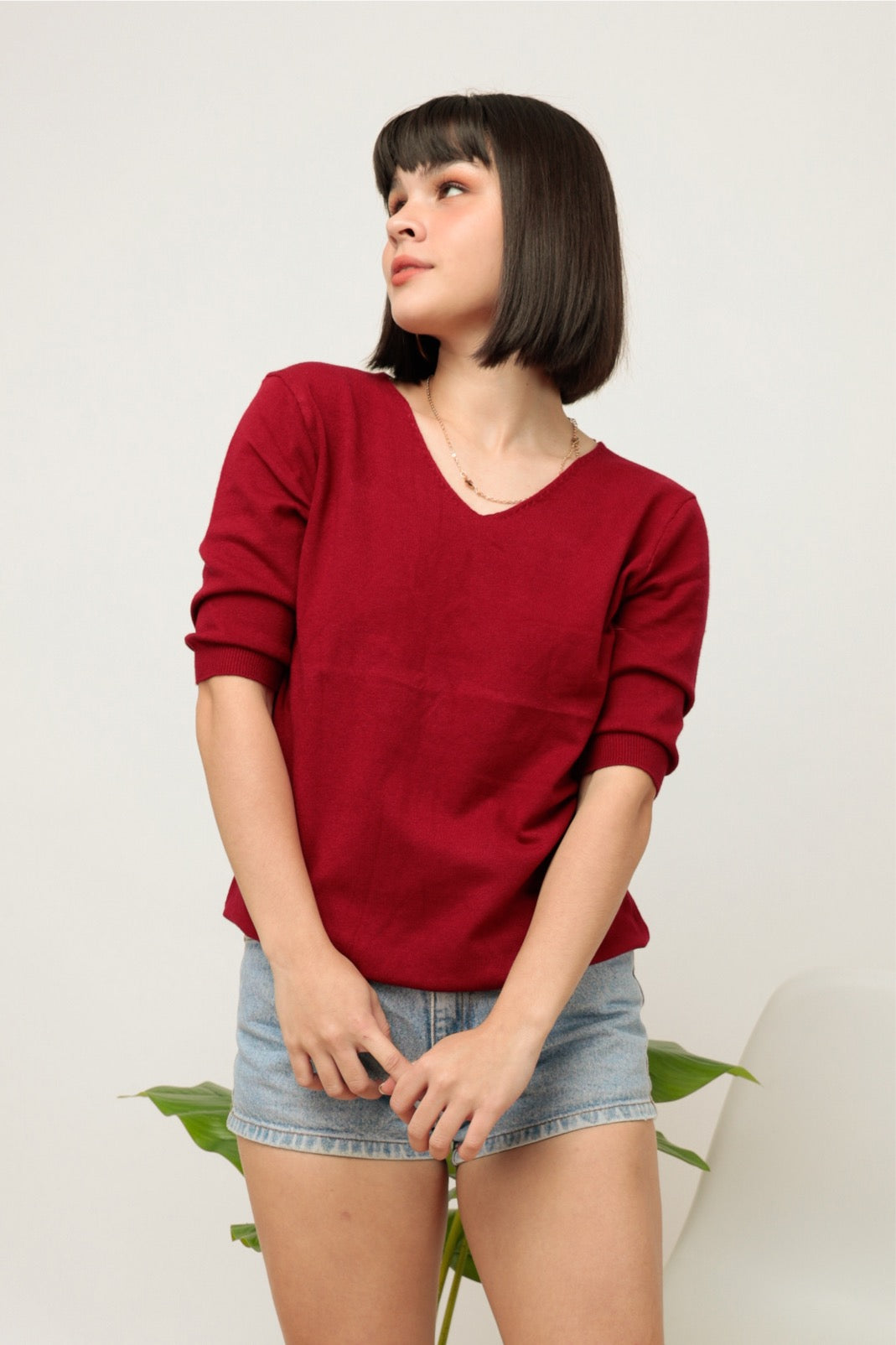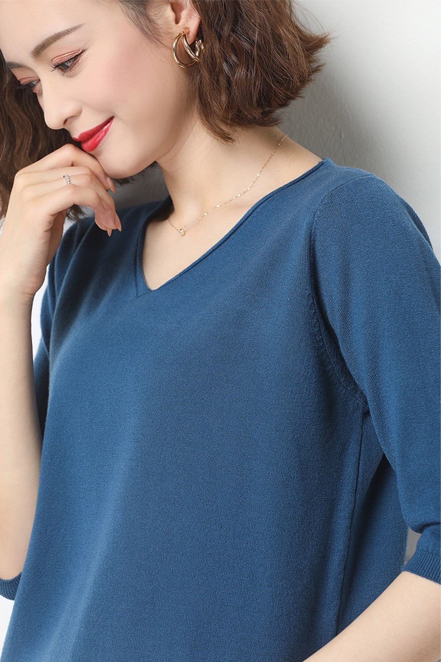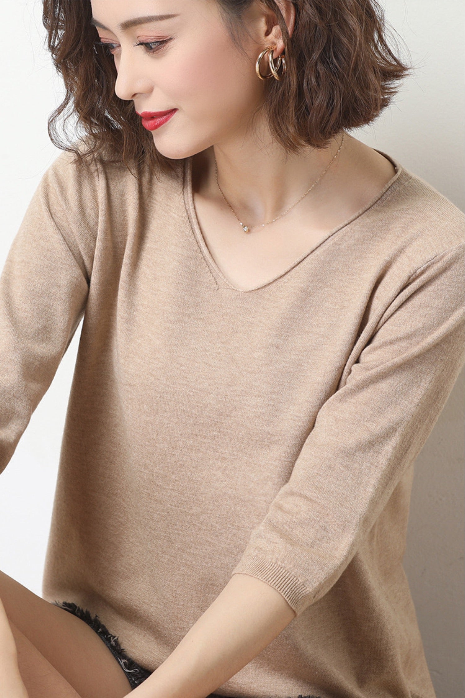 A very stretchy knit full oversized top featuring V neckline, 3/4 sleeves, and a relaxed fit.