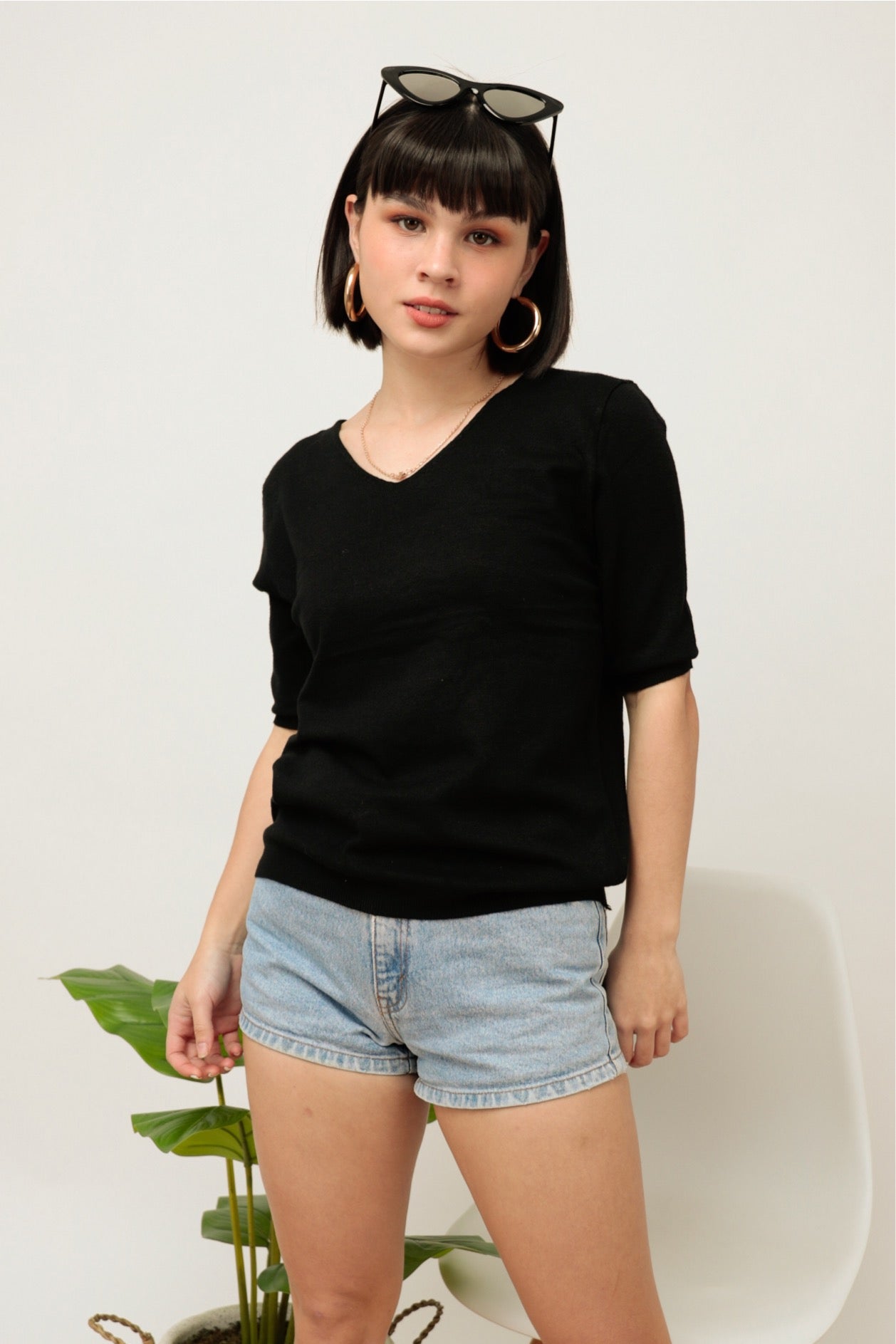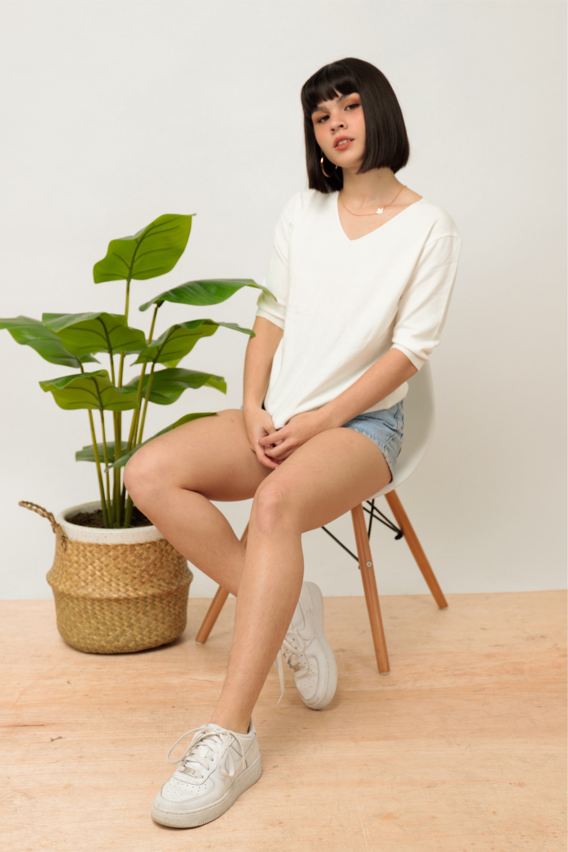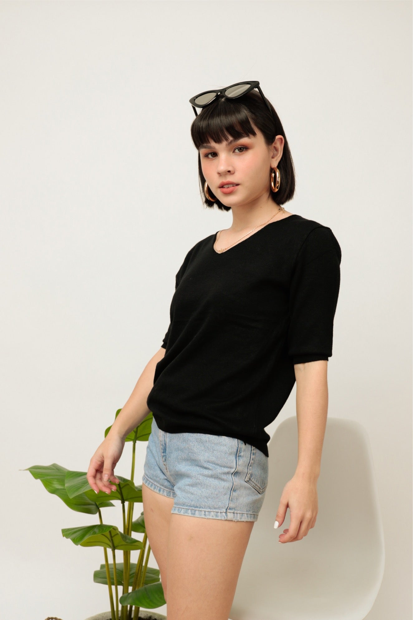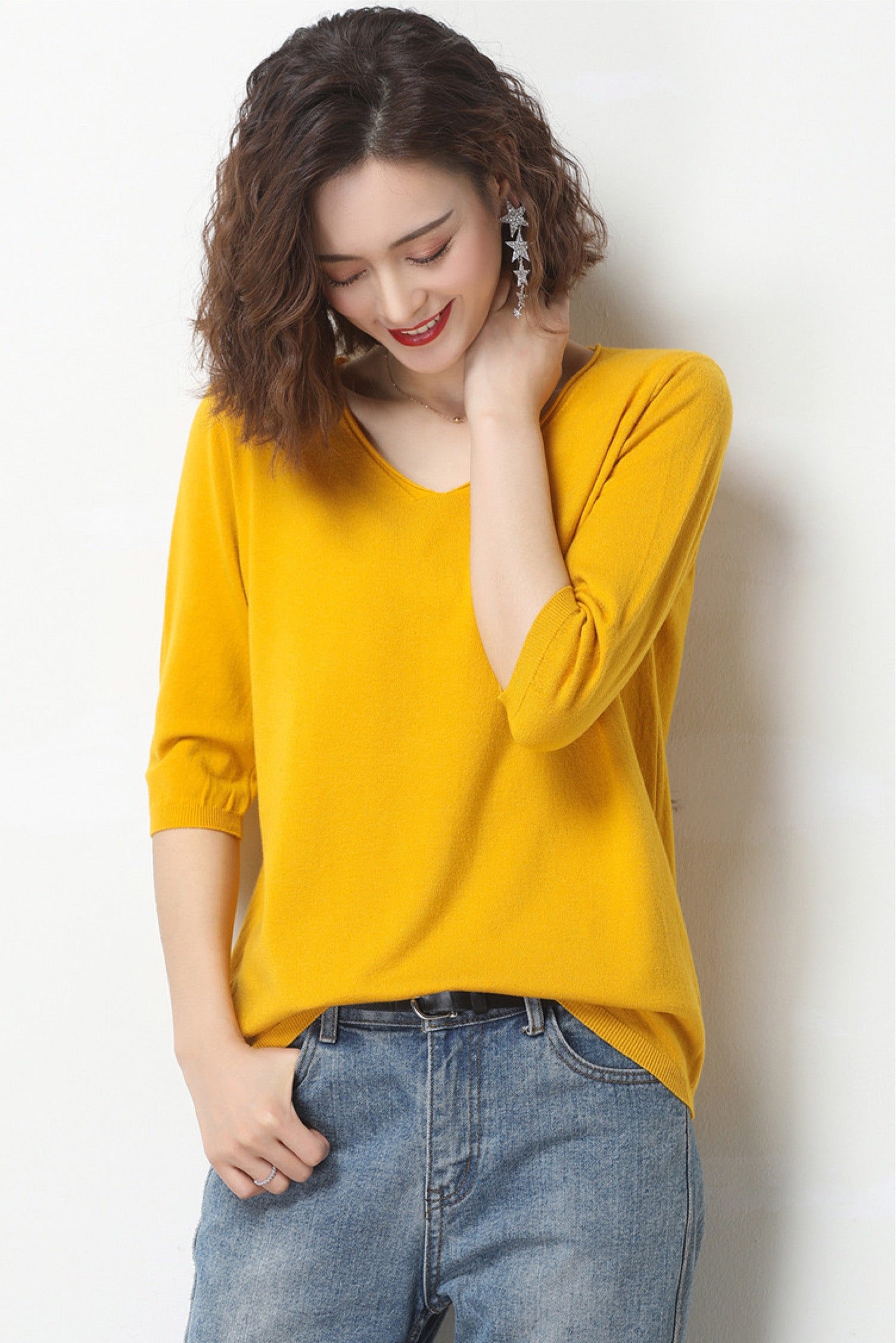 A very stretchy knit full oversized top featuring V neckline, 3/4 sleeves, and a relaxed fit.