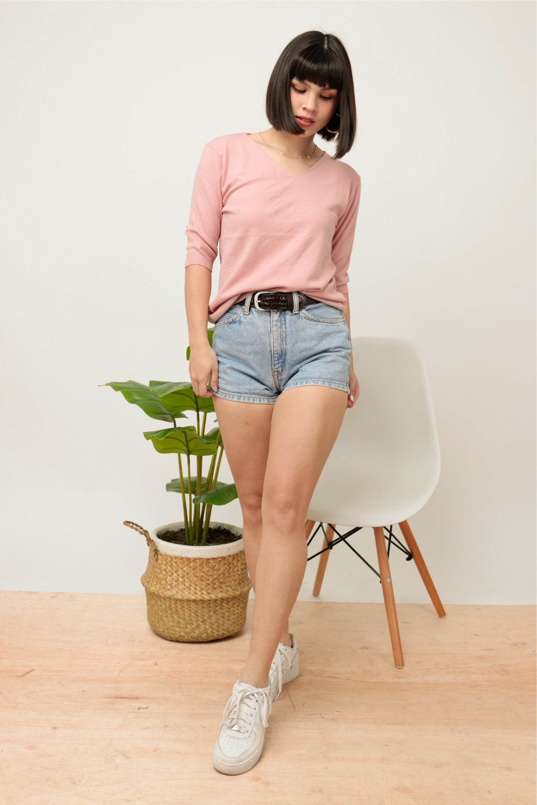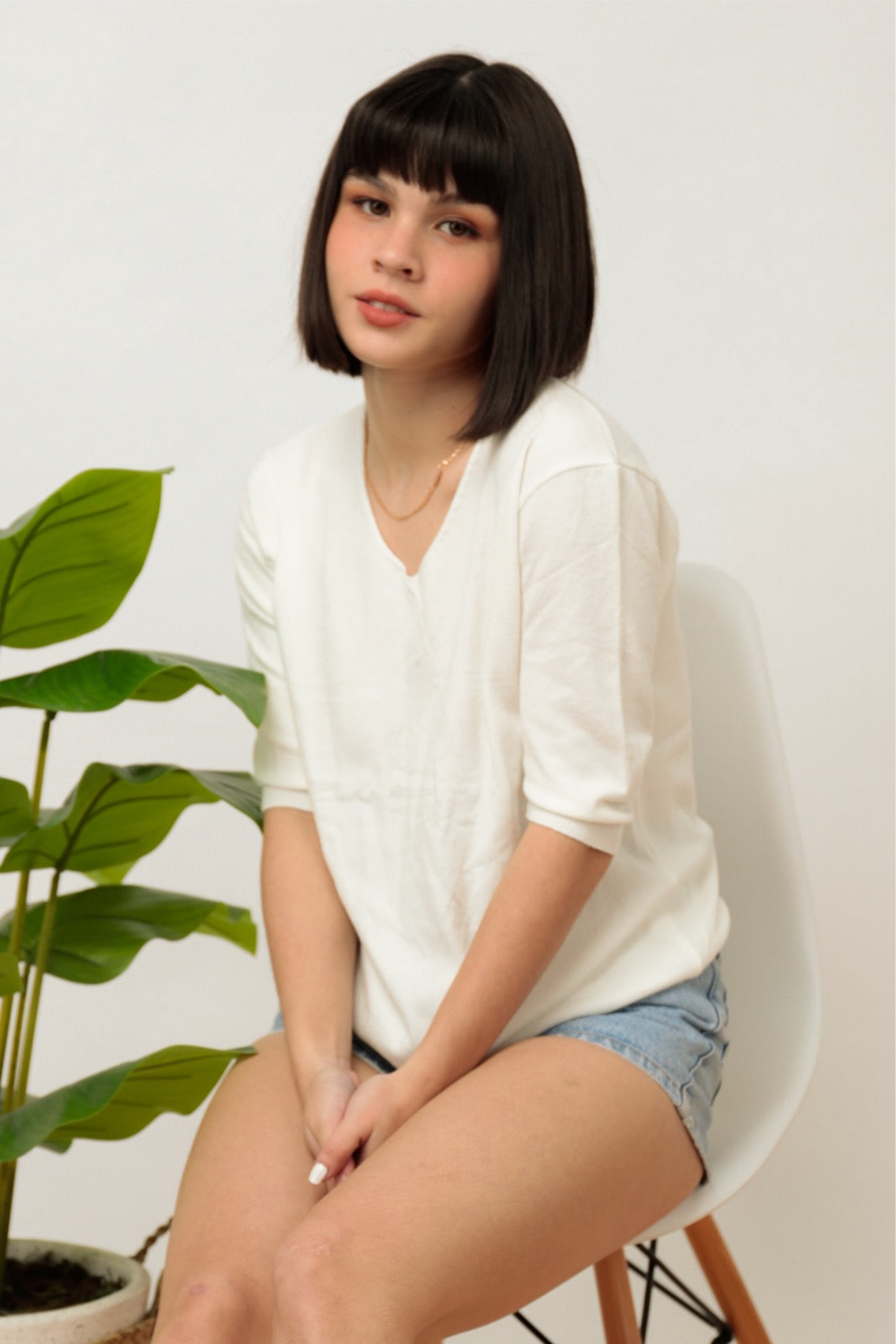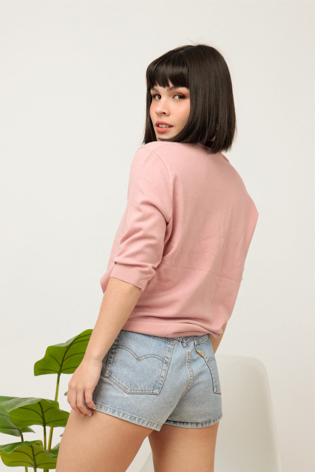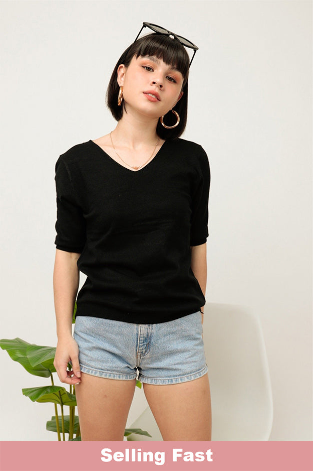 A very stretchy knit full oversized top featuring V neckline, 3/4 sleeves, and a relaxed fit.