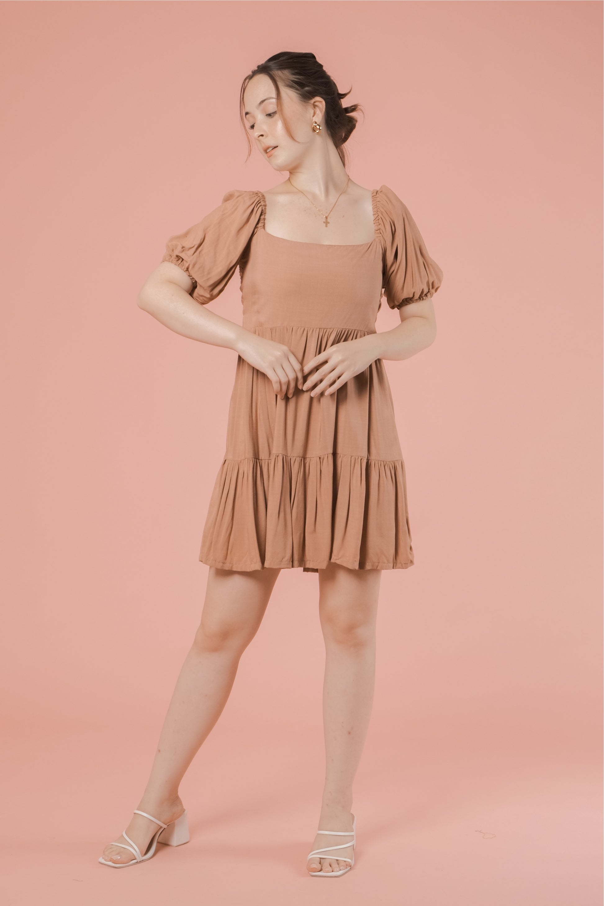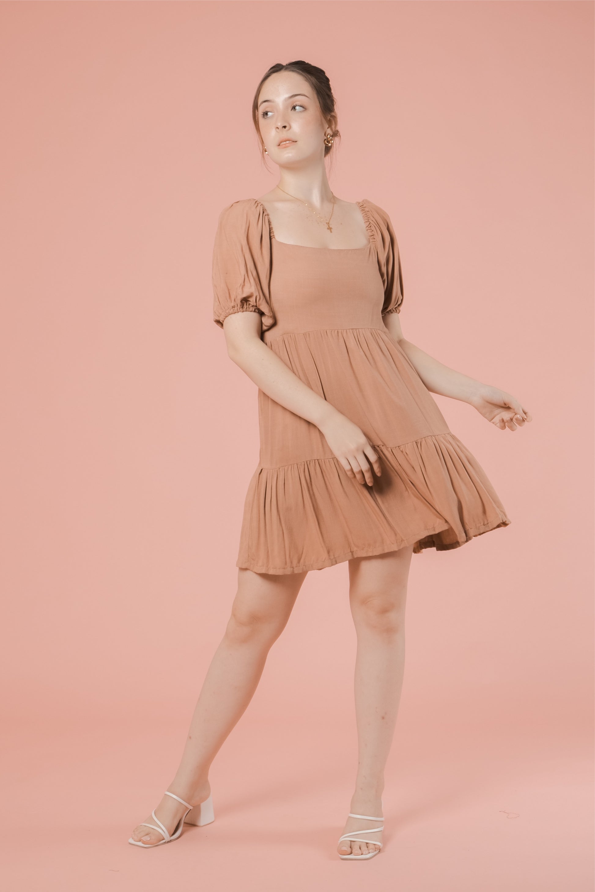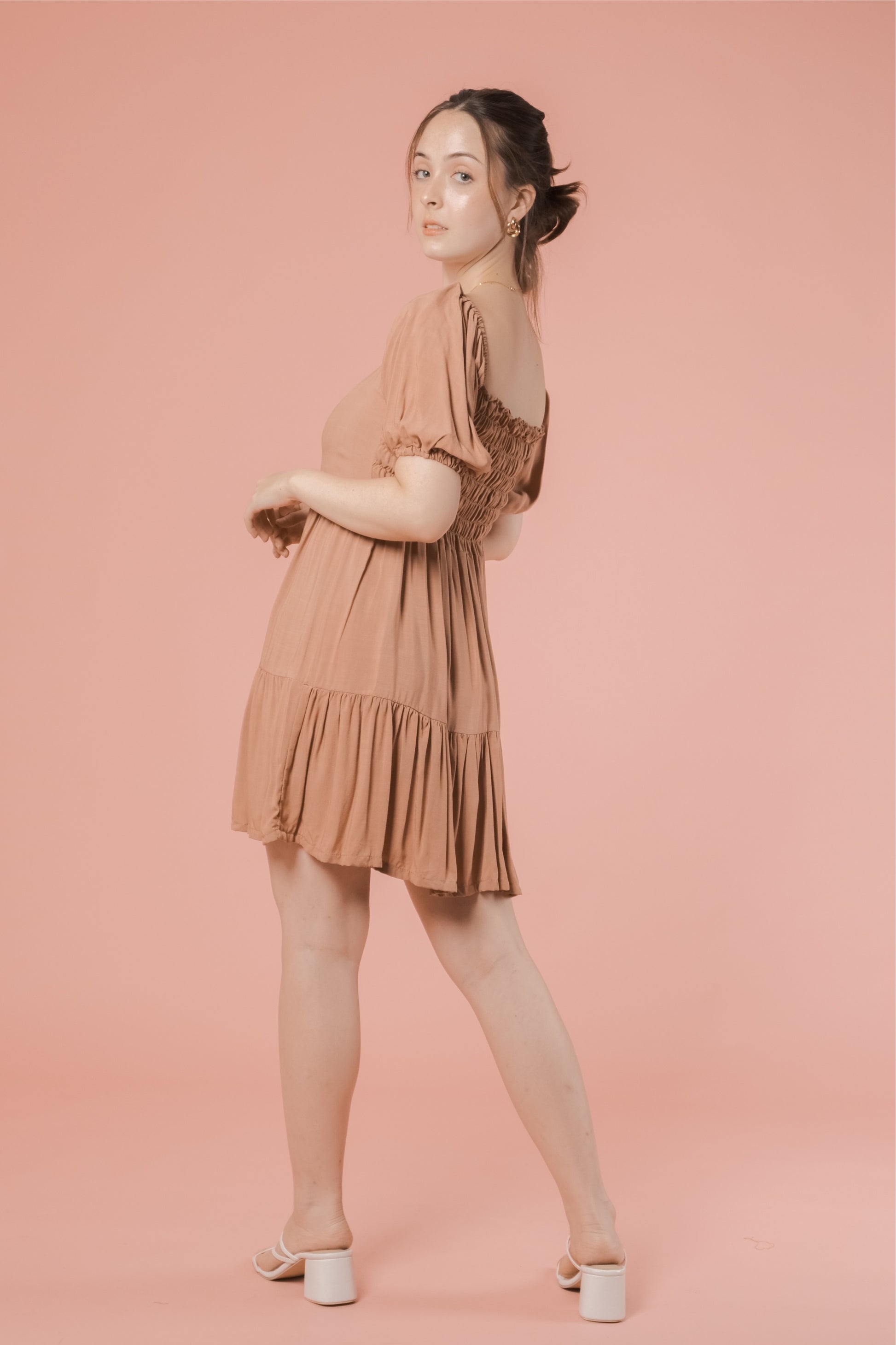 A woven dress featuring square neckline, puff short sleeves, smocked back bodice, and flowy silhouette.
