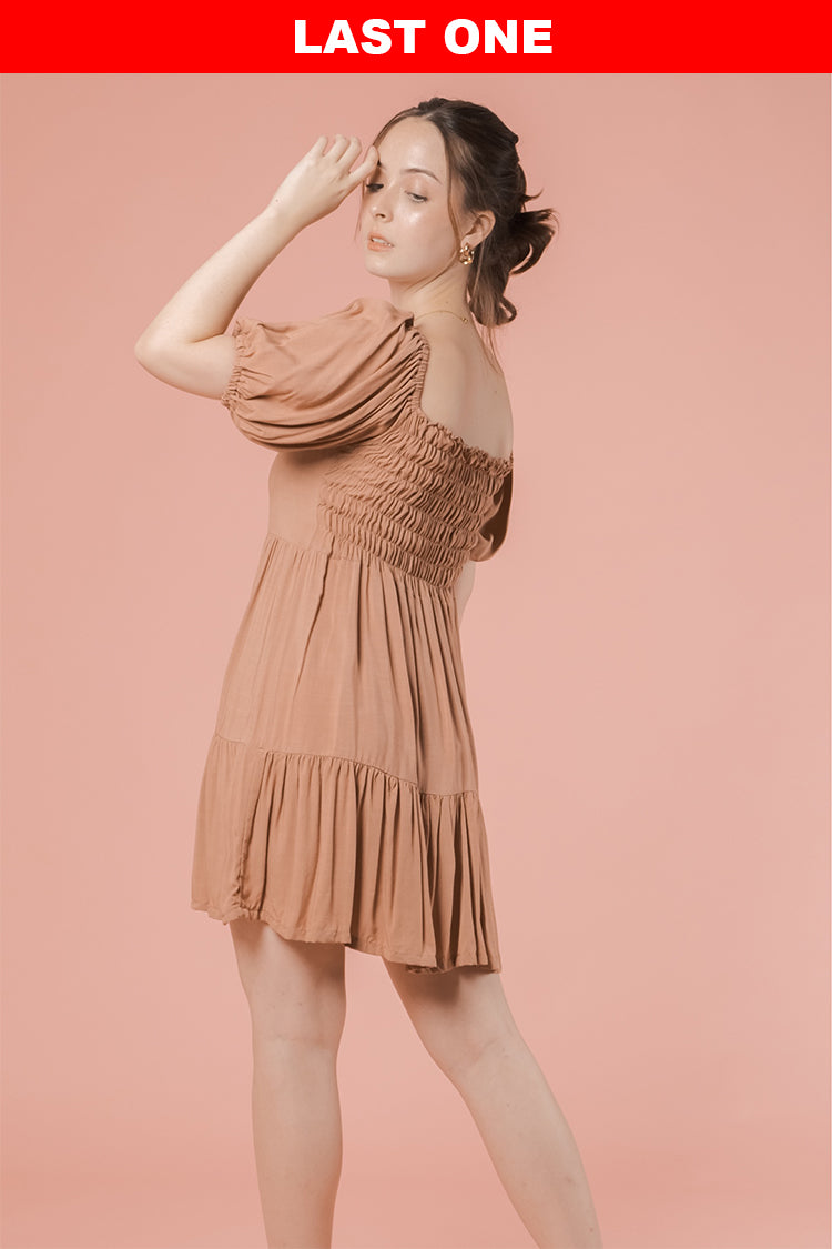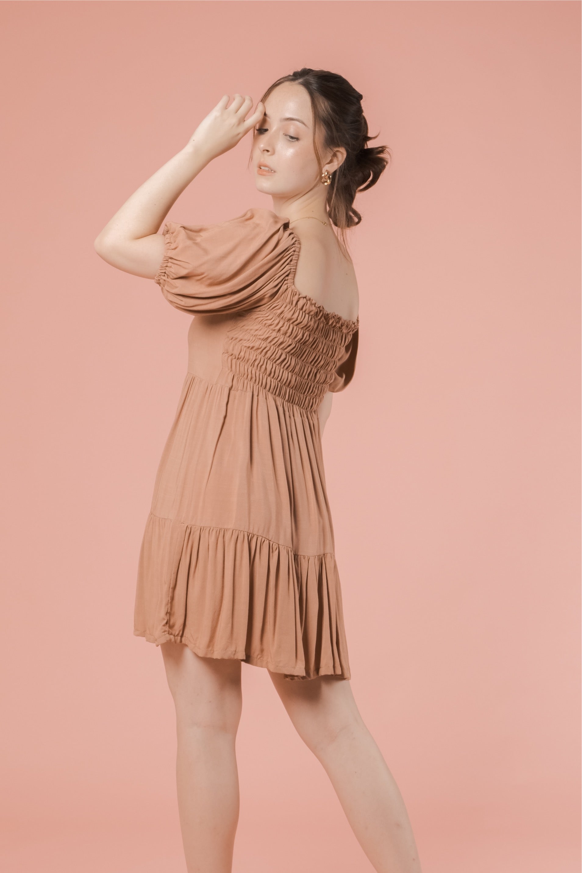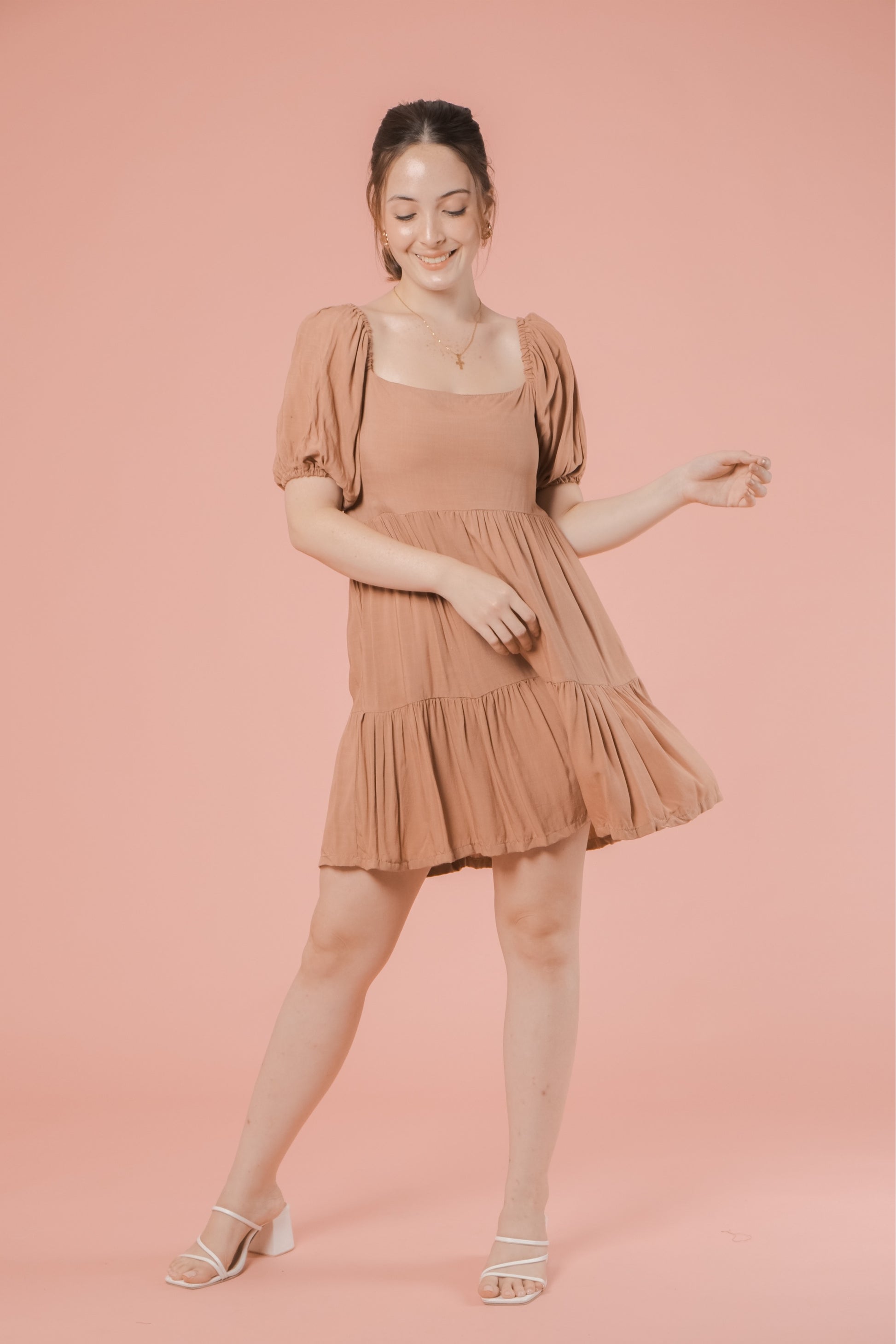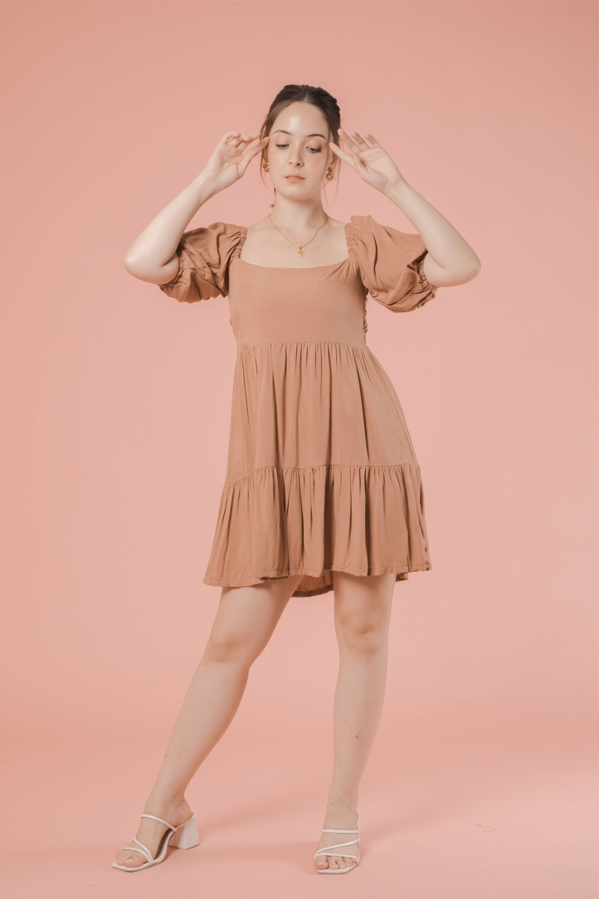 A woven dress featuring square neckline, puff short sleeves, smocked back bodice, and flowy silhouette.