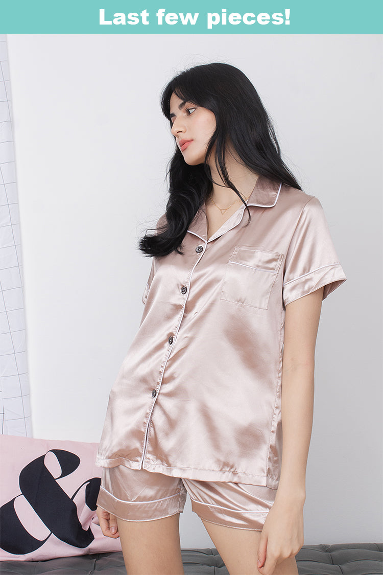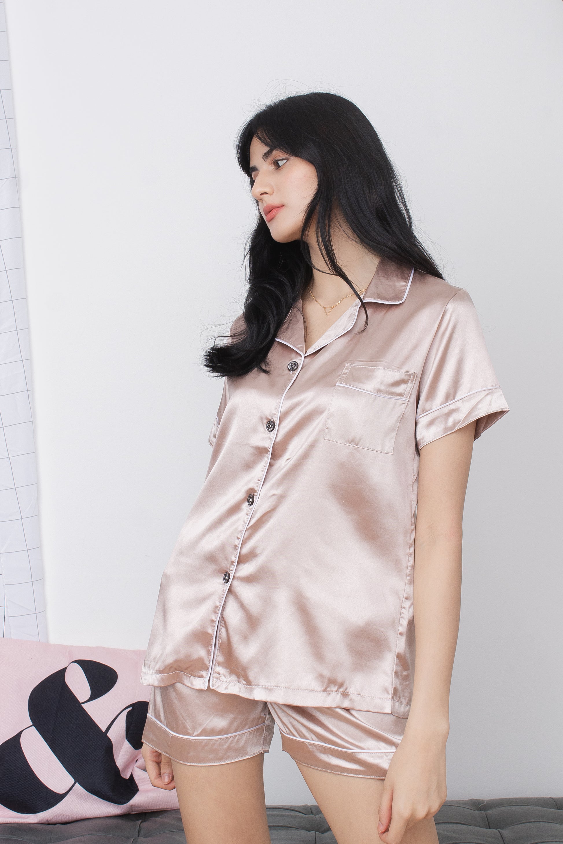 A soft silky woven pajama featuring a sleep shirt with contrasting piped trim, curved notched collar, button-down front that ends in a vented hem, jetted chest pocket, and short sleeves, and a pair of elasticized high-rise shorts with an elasticized waist.