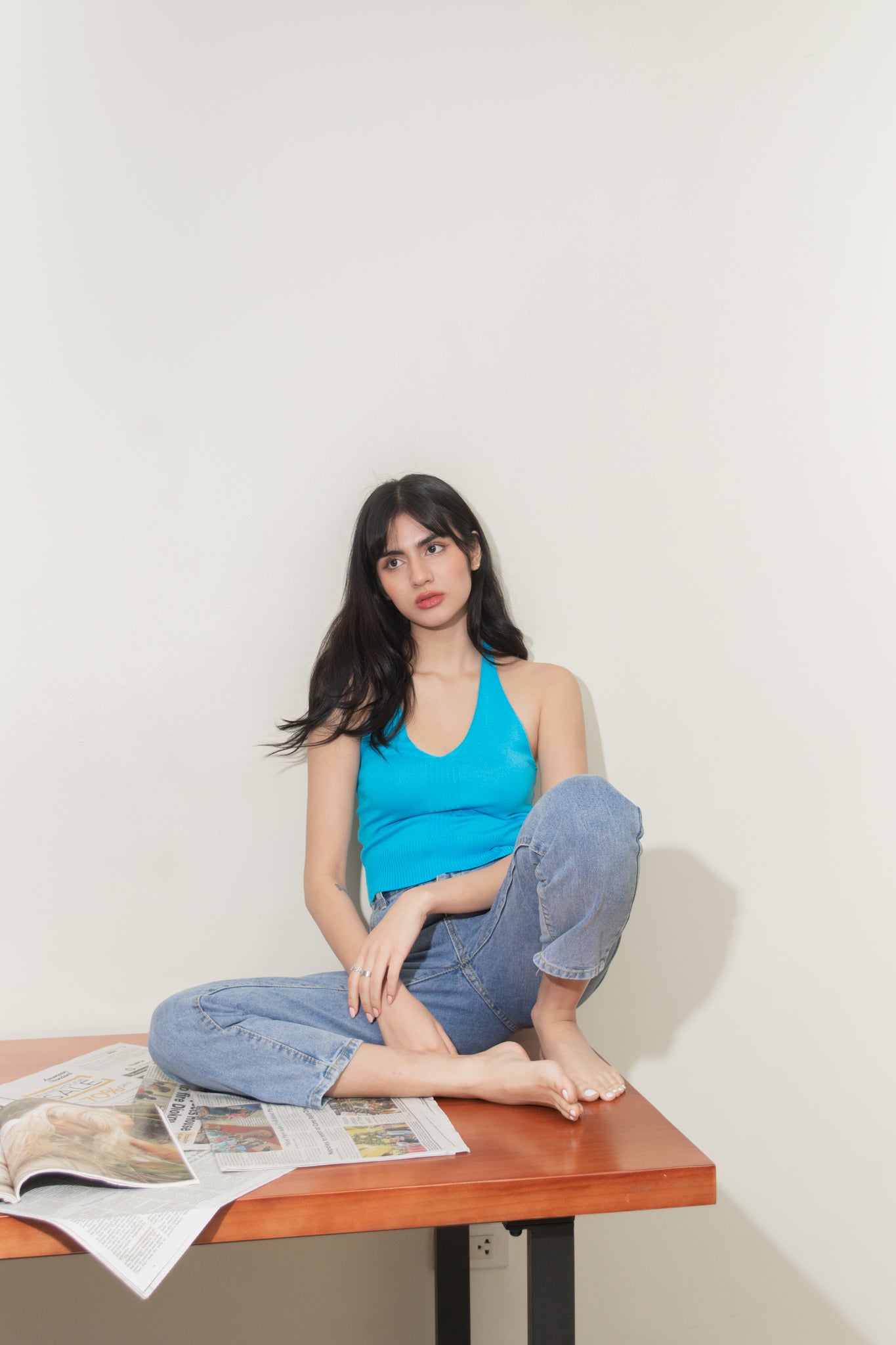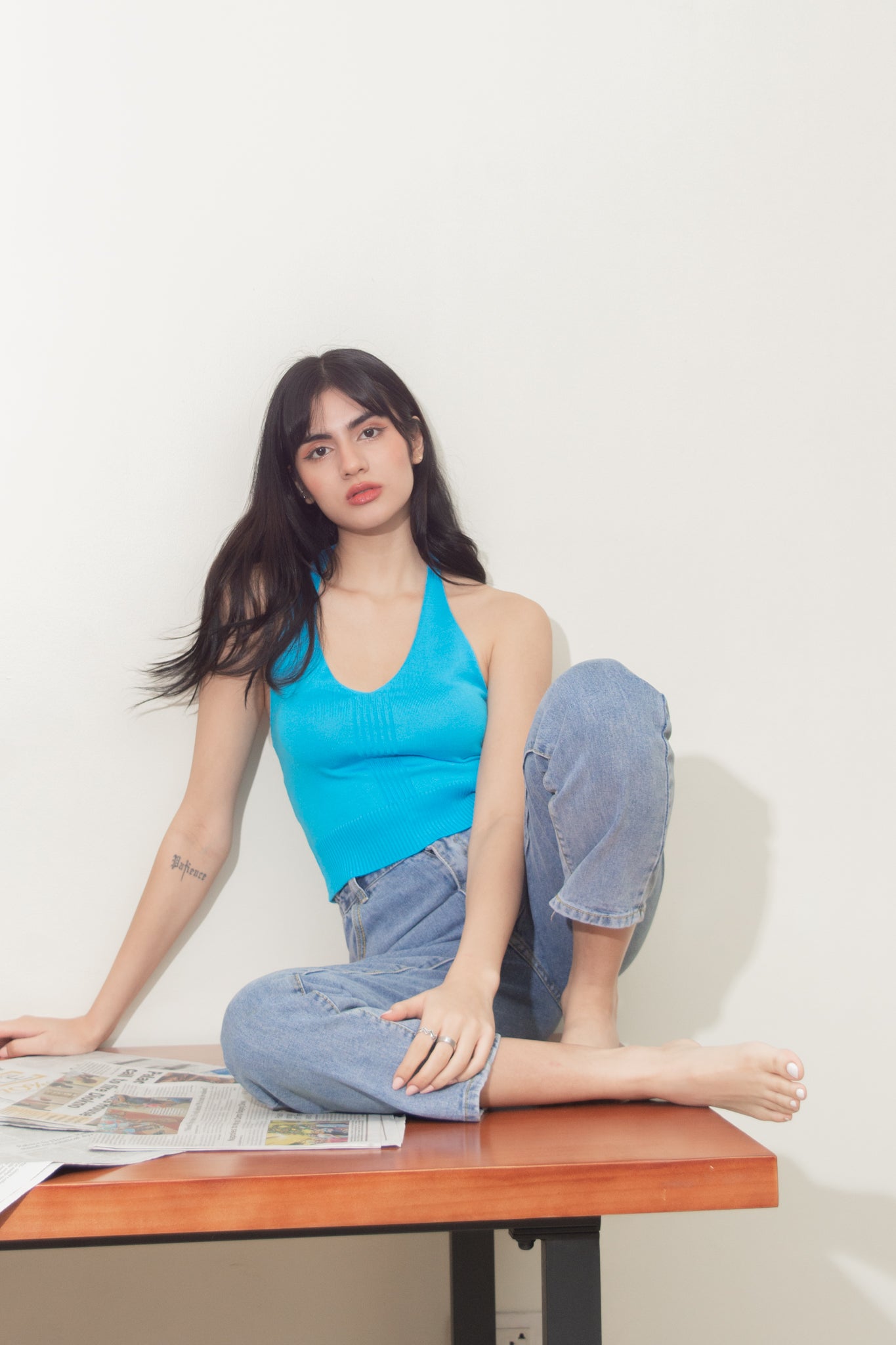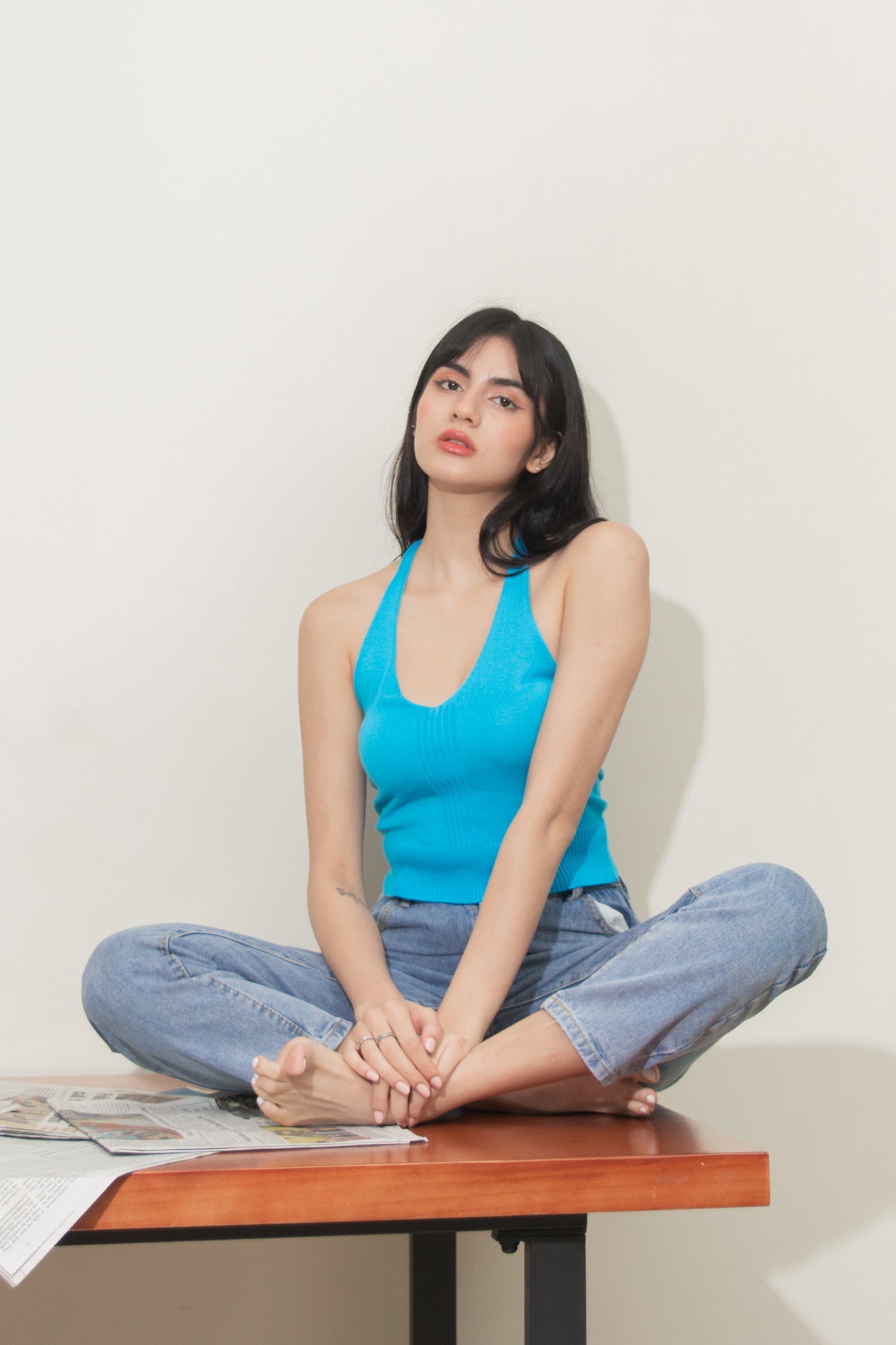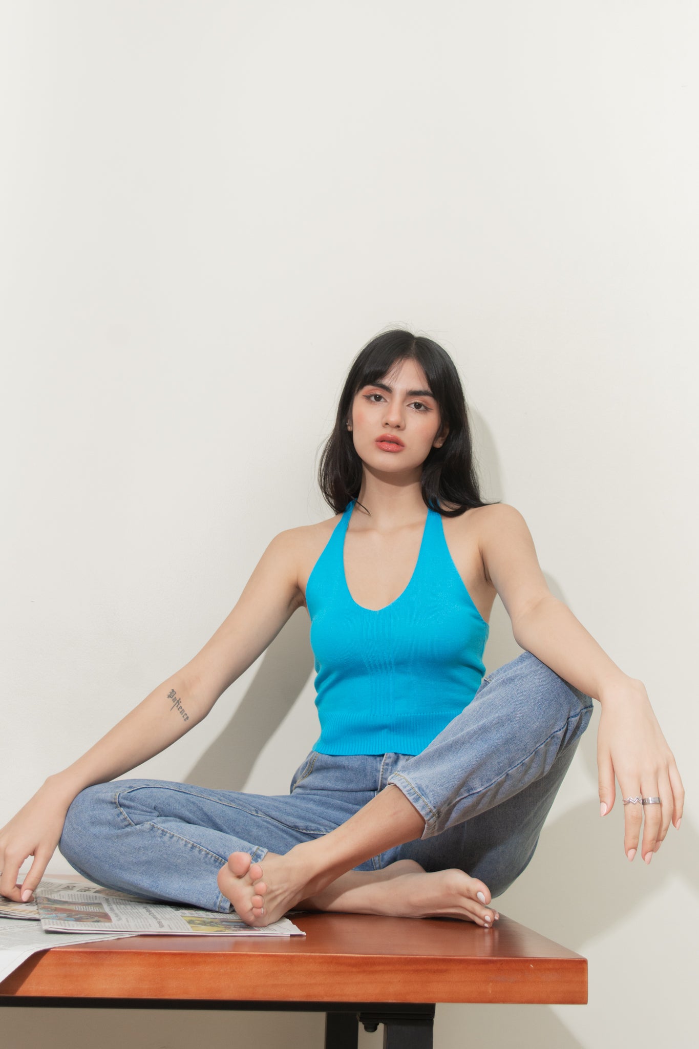 A cropped knit top featuring a halter neckline with a self-tie closure.