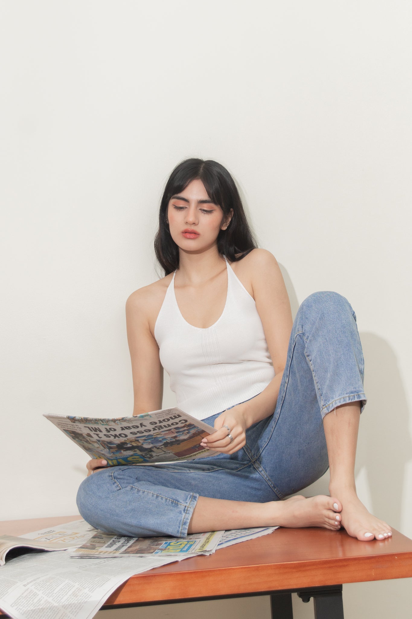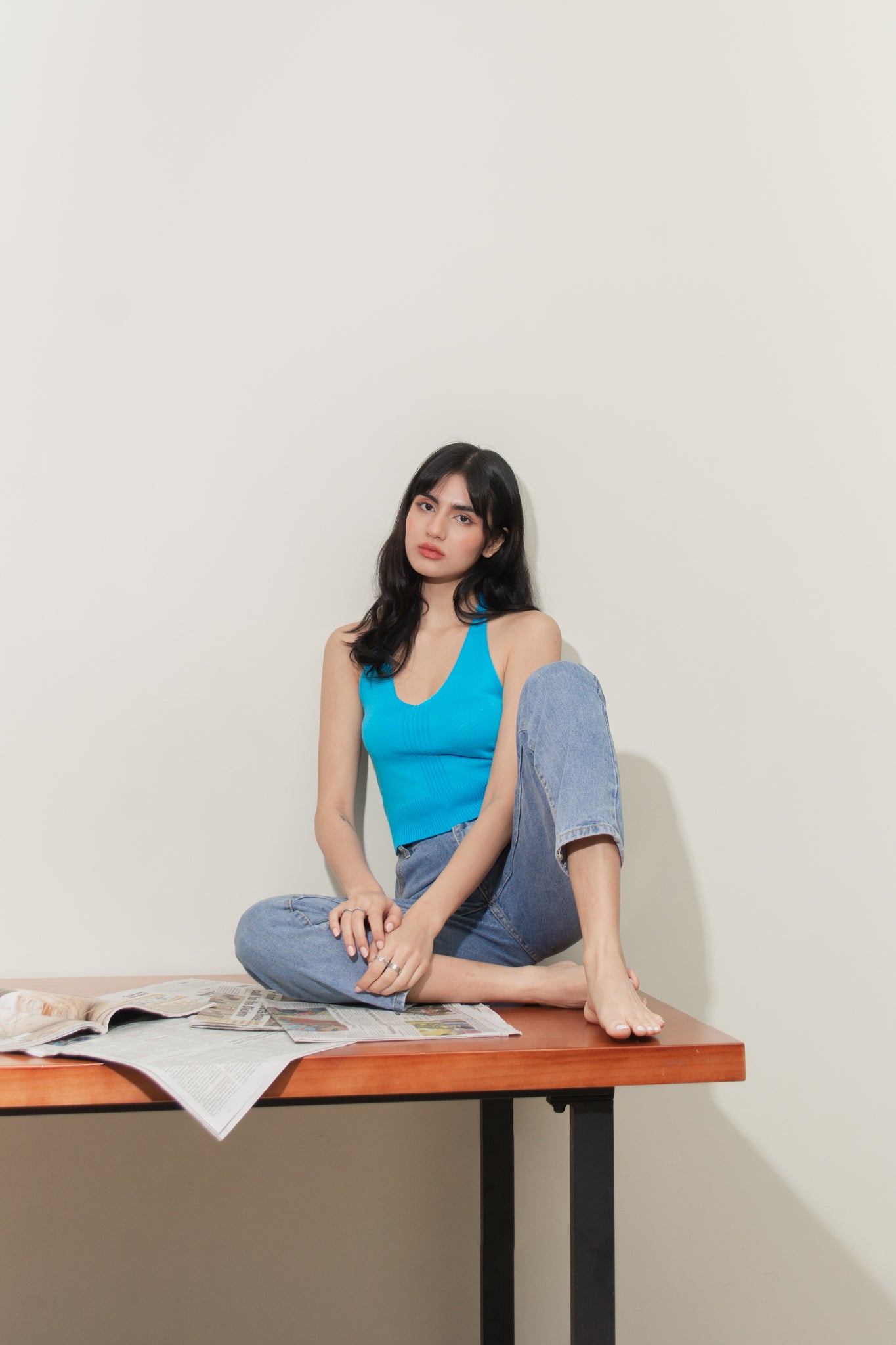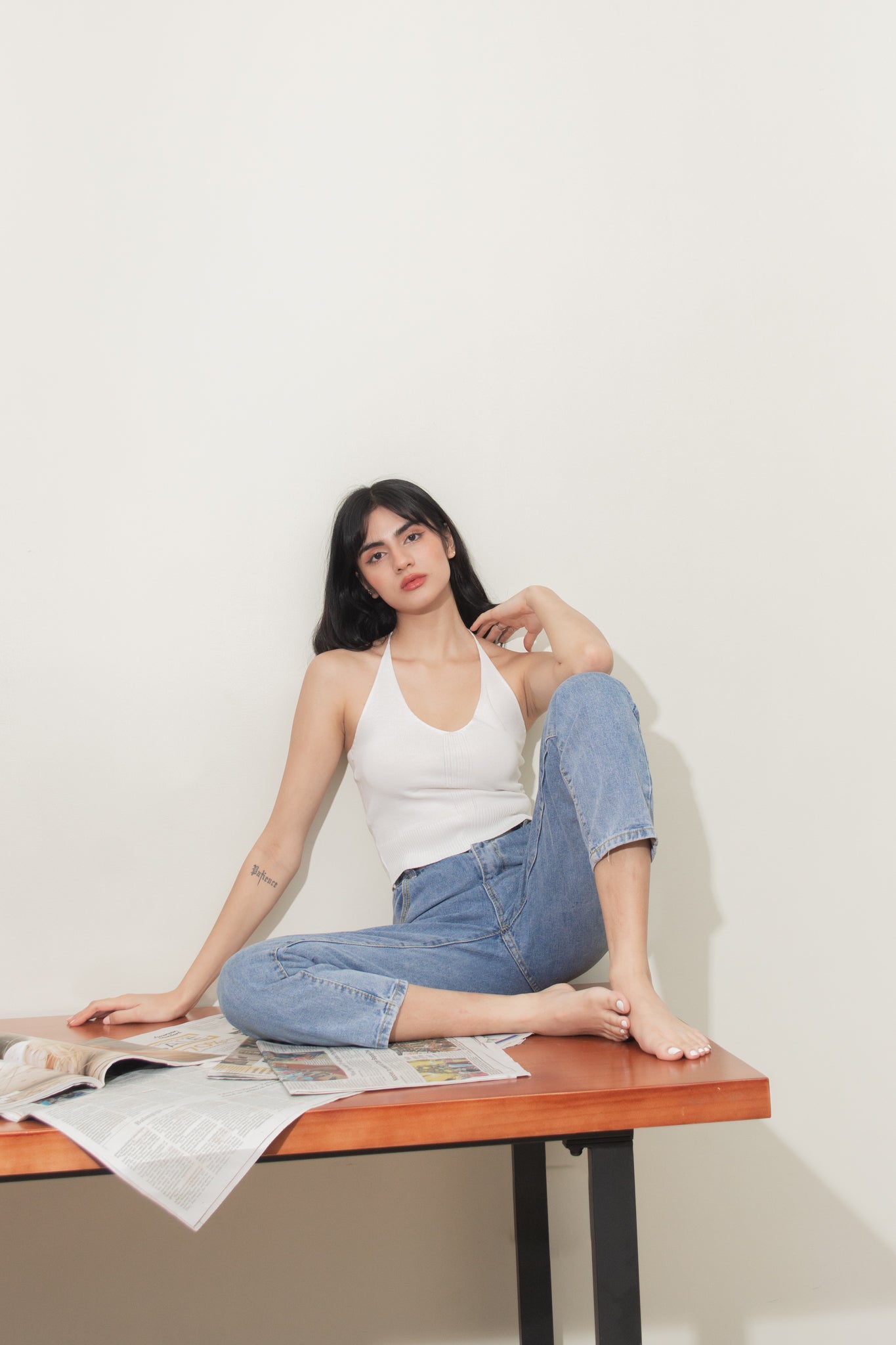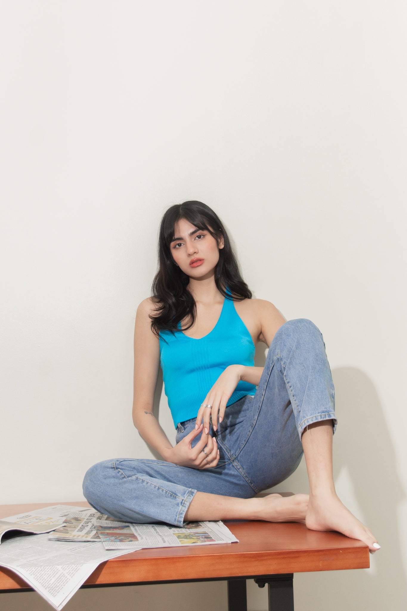 A cropped knit top featuring a halter neckline with a self-tie closure.