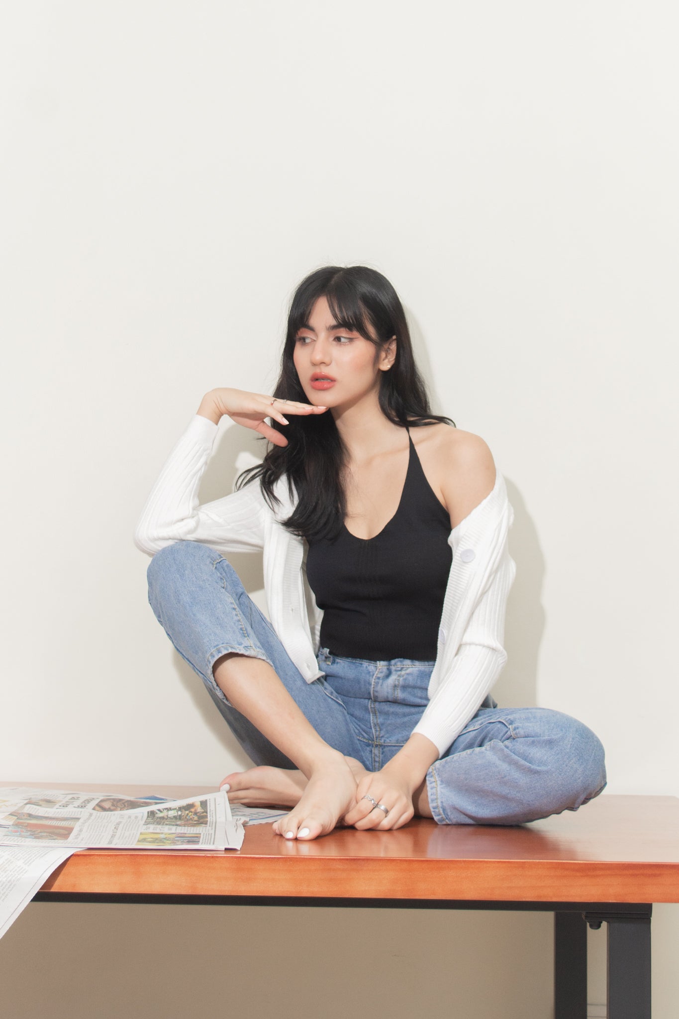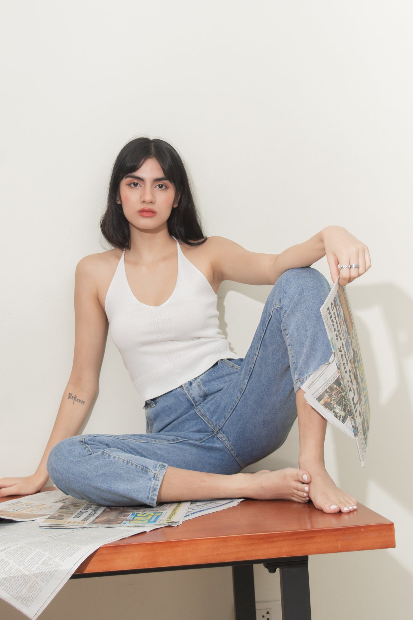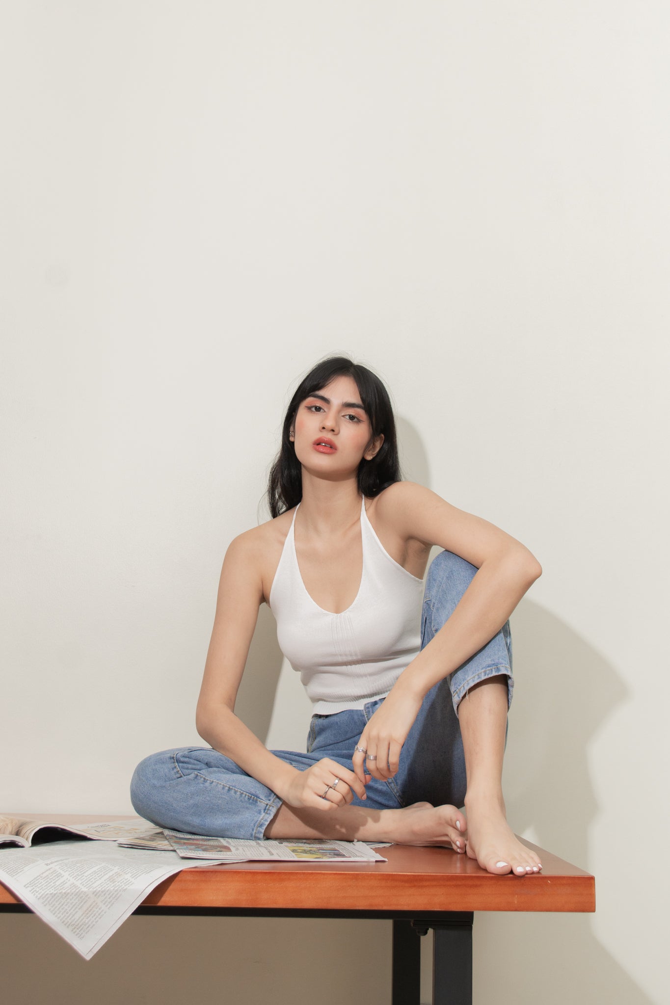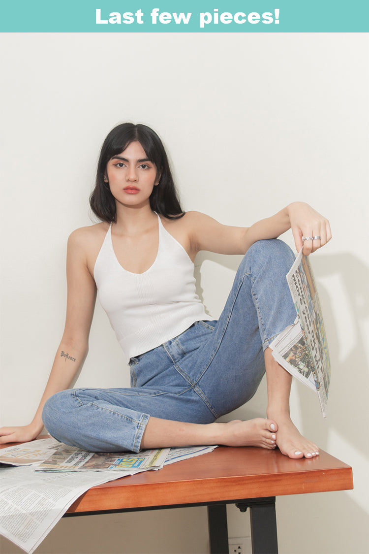 A cropped knit top featuring a halter neckline with a self-tie closure.